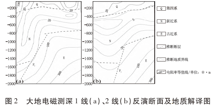 勘查區(qū)內(nèi)主要斷裂構(gòu)造均為區(qū)域性斷裂的次生斷裂,主要有NNE向張完集斷裂F1和EW 向的渦河斷裂F推1(圖1)。前人在區(qū)內(nèi)布設(shè)有兩條大地電磁測(cè)深平行剖面(1線、2線),通過明顯的“V”型寬大低阻異常和同步向下彎曲典型斷裂異常特征,于區(qū)內(nèi)東側(cè)邊界解譯推斷了走向約40°、NWW 傾的張完集斷裂F1(圖2)。渦河斷裂F推1位于勘查區(qū)南側(cè)亞珠石油城—化肥廠一線,該斷裂為亳州隆起的北界斷裂,其主要通過重力資料推測(cè)為EW 走向、N傾的正斷層。